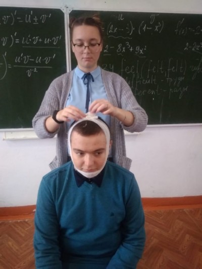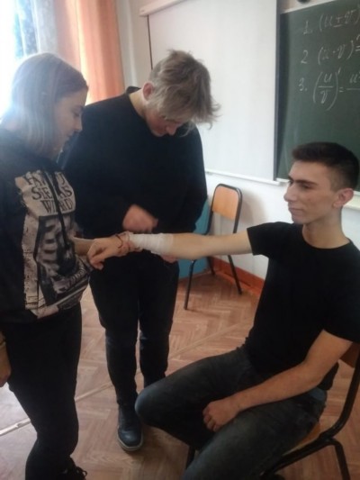 Педагог - организатор ОБЖ, Соколенко Сергей Сергеевич, рассказал старшеклассникам о наложении повязок, а ребята попробовали наложить давящую повязку на руку, повязку на кисть и прощевидную повязку при переломе челюсти.